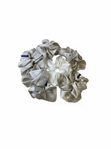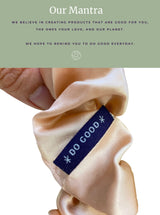 This super soft scrunchie is made with 19 momme Mulberry Silk. Because silk has a molecular structure that keeps moisture in your hair, this scrunchie is able to reduce frizz, tangles, static and creases, leaving your hair silky and free from ridges and that damaging tug.