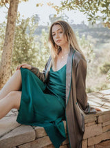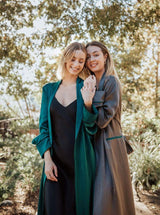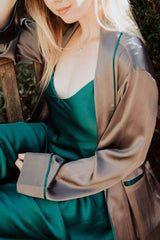 Relaxation for all. Lounge in luxe in this 100% Mulberry Silk smoking robe with complimentary contrasting trim color. Made with an oversized fit for extra comfort and 2 functional pockets, this midi-length robe is the perfect companion to the More Sunday Slip Dress.